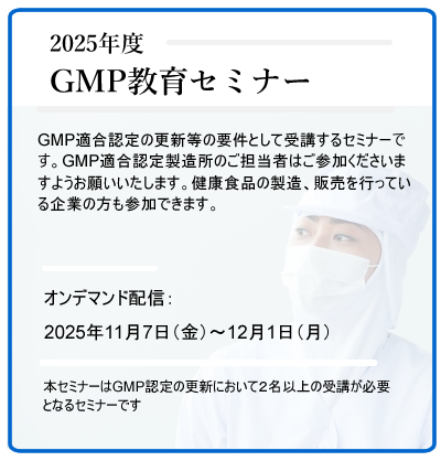 本セミナーはGMP認定の更新において2名以上の受講が必要となるセミナーです。GMP認定工場のご担当者様はご参加くださいますようお願い申し上げます。