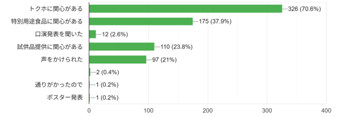 (2)展示コーナーにお越しいただいた理由(1つ以上選択、複数選択可)は次のとおりでした。来場者からは教材を各種講義に活用したい、大学生向け授業実施について相談したい等のご意見も複数いただきました。また、トクホについては展示品の関与成分による作用メカニズムの違いや使用方法等に関するご質問等、特別用途食品については、これだけ多くの特別用途食品は初めて見た等の感想、経口補水液の違いに関するご質問等をいただきました。 ![]()
